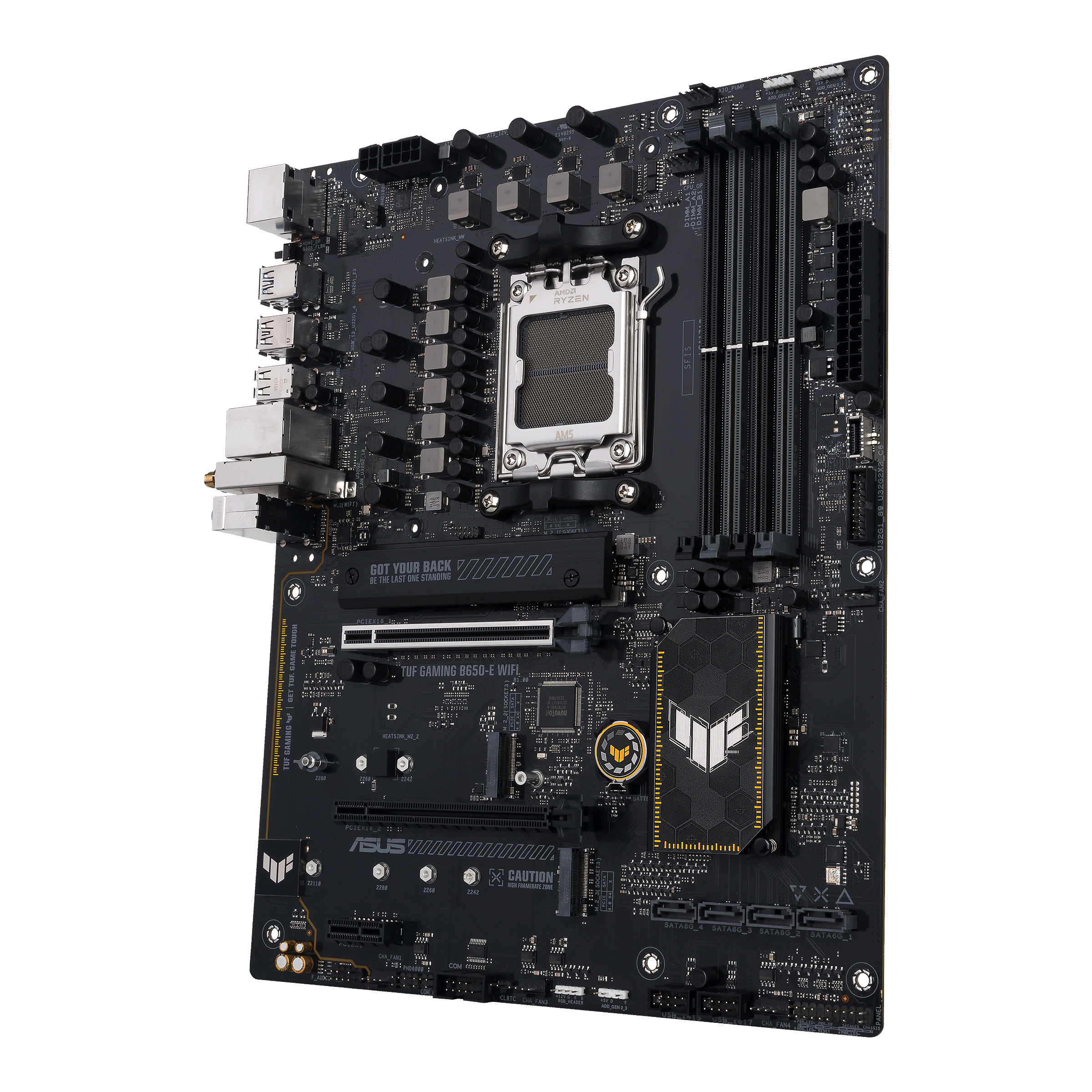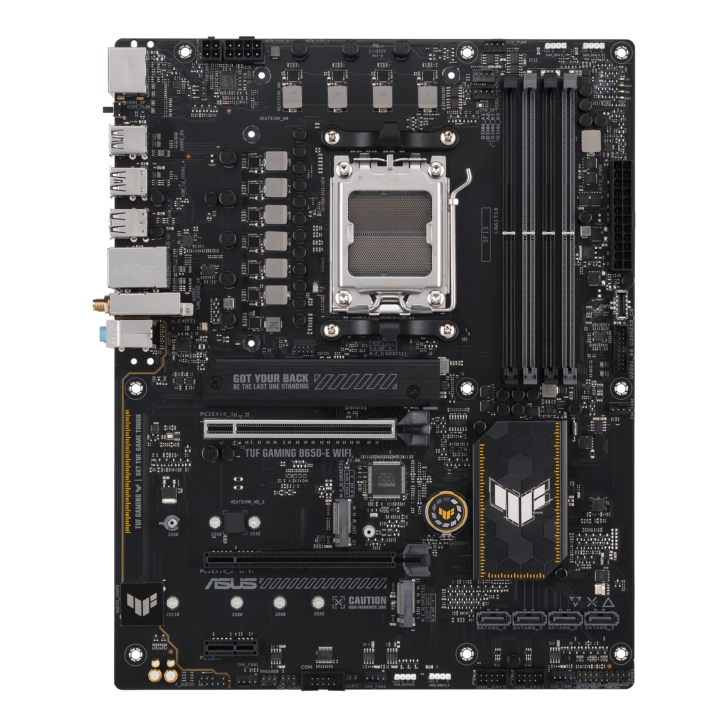 ASUS TUF GAMING B650-E WIFI. Procesoriaus gamintojas: AMD, Procesoriaus lizdas: AM5 lizdas, Palaikomi procesoriaus lizdai: AM5 lizdas. Palaikomi atminties tipai: DDR5-SDRAM, Maksimali vidinė atmintis: 192 GB, Atminties angų tipas: DIMM. Palaikomi saugojimo kaupiklių sąsajos: M.2, SATA III, Palaikomi saugojimo kaupiklių tipai: HDD & SSD, RAID lygiai: 0, 1, 10. Eterneto sąsajos tipas: 2.5 Gigabit Ethernet, „Wi-Fi“ standartas: Wi-Fi 6E (802.11ax), Wi-Fi standartai: 802.11a, 802.11b, 802.11g, Wi-Fi 4 (802.11n), Wi-Fi 5 (802.11ac), Wi-Fi 6 (802.11ax), Wi-Fi 6E.... Taikoma: PC, Motininės plokštės formos faktorius: ATX, Motininės plokštės sisteminio valdiklio šeima: AMD
