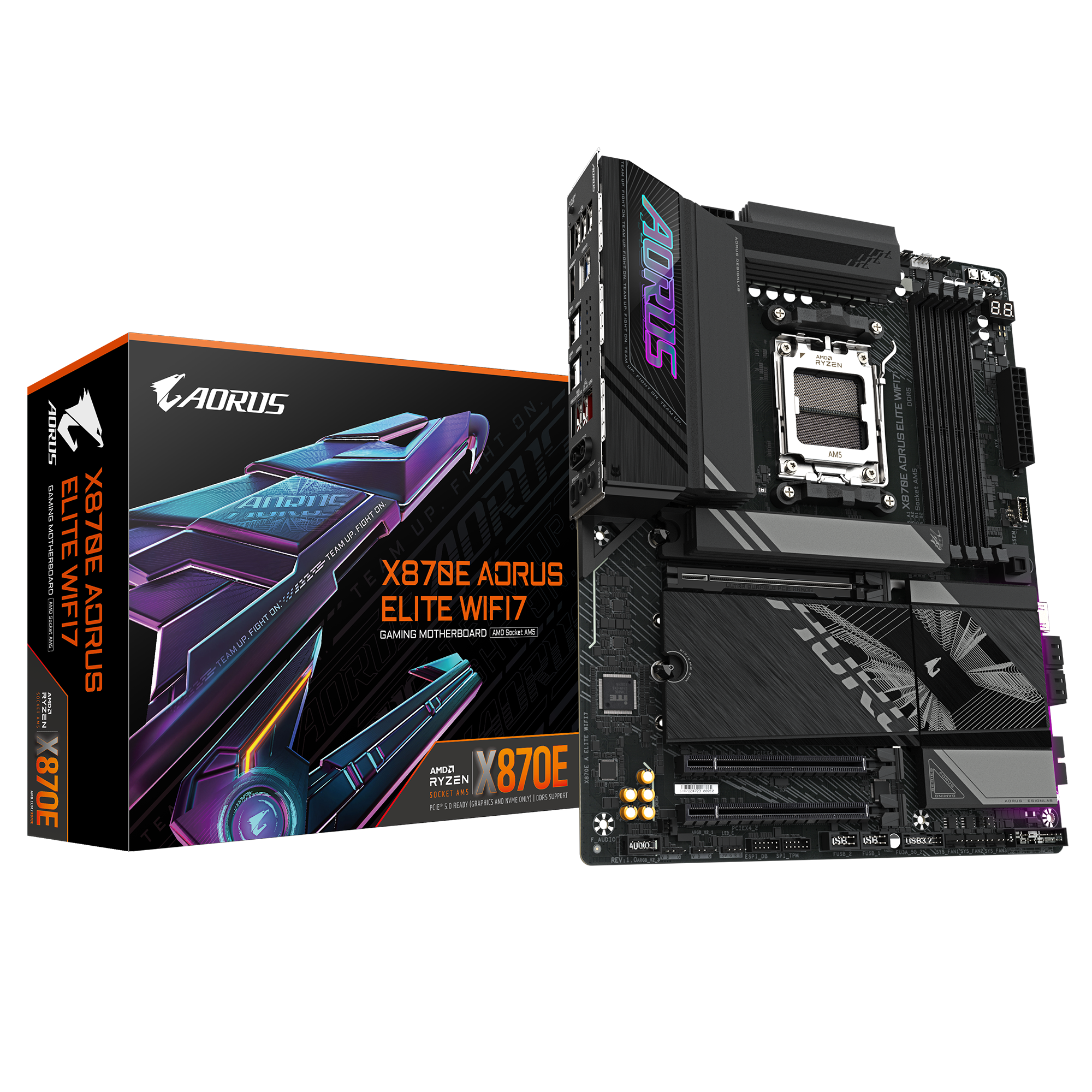 GIGABYTE X870E AORUS ELITE WIFI7. Procesoriaus gamintojas: AMD, Procesoriaus lizdas: AM5 lizdas, Procesorių suderinamumas: AMD Ryzen 7000 Series, AMD Ryzen 8000 Series, AMD Ryzen 9000 Series. Palaikomi atminties tipai: DDR5-SDRAM, Maksimali vidinė atmintis: 256 GB, Atminties angų tipas: DIMM. Palaikomi saugojimo kaupiklių sąsajos: M.2, SATA III, Palaikomi saugojimo kaupiklių tipai: HDD & SSD, RAID lygiai: 0, 1, 10. Eterneto sąsajos tipas: 2.5 Gigabit Ethernet, LAN kontroleris: Realtek RTL8125, „Wi-Fi“ standartas: Wi-Fi 7 (802.11be). Taikoma: PC, Motininės plokštės formos faktorius: ATX, Motininės plokštės sisteminio valdiklio šeima: AMD