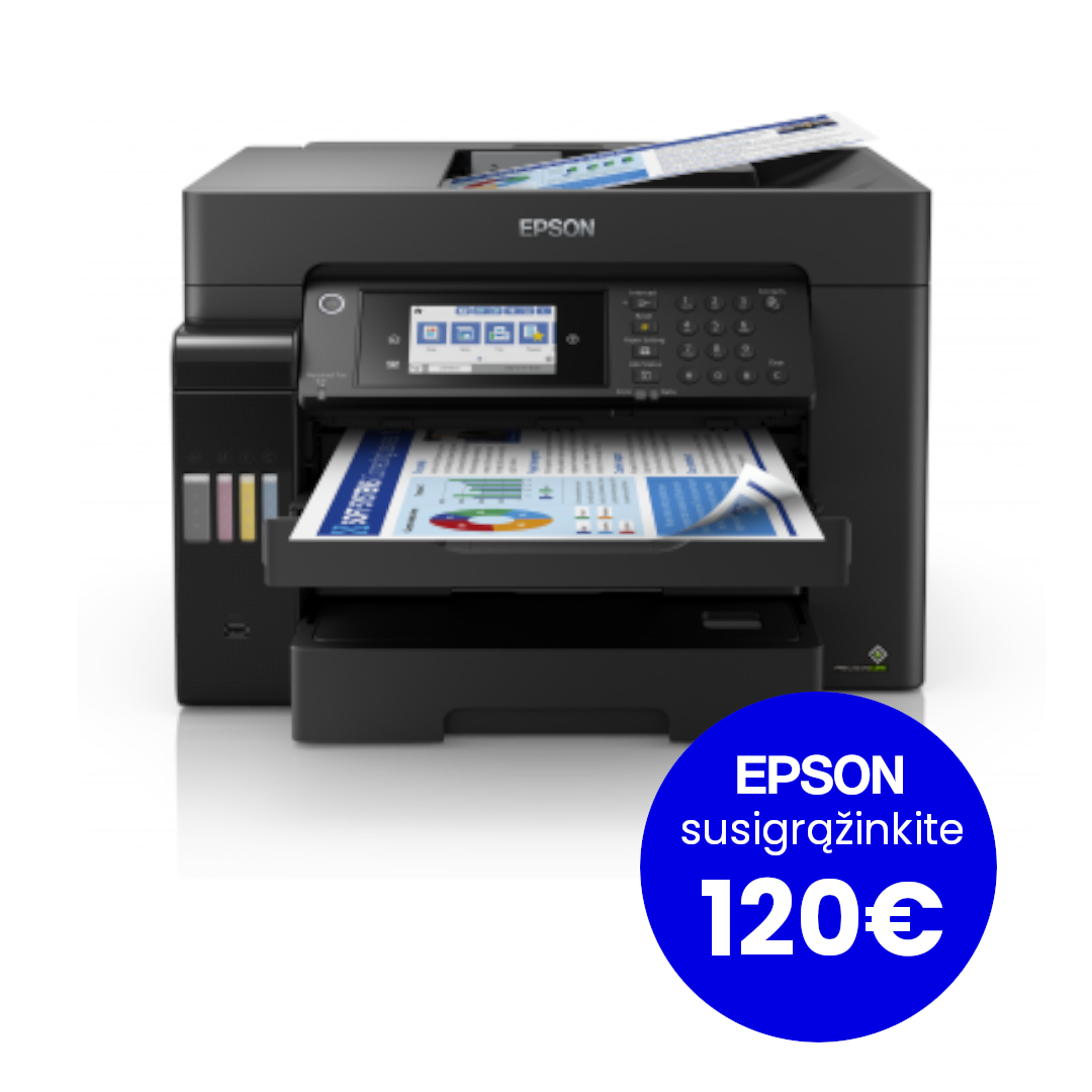 Epson EcoTank L15150. Spausdinimo technologija: Rašalinis, Spausdinimas: Spalvotas spausdinimas, Maksimali rezoliucija: 4800 x 2400 DPI, Spausdinimo greitis (spalvotai, normalios kokybės, A4/US Letter): 22 ppm. Kopijavimas: Spalvotas kopijavimas. Skenavimas: Spalvotas skenavimas. Siuntimas faksu: Spalvoto fakso siuntimas. Didžiausias ISO A serijos popieriaus dydis: A3+. „Wi-Fi“. Tiesioginis spausdinimas. Produkto spalva: Juoda